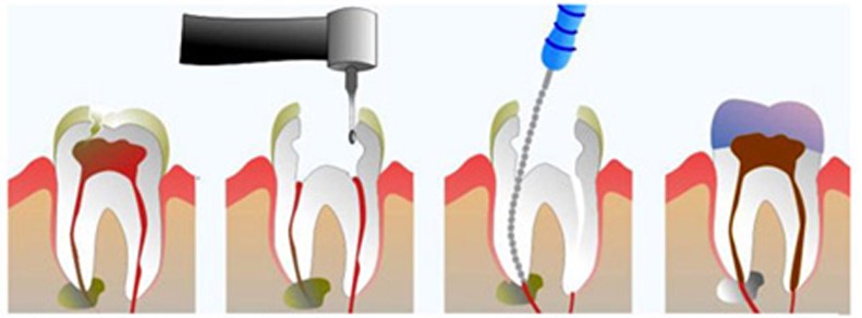 - A polpa e o tecido infetado são removidos e os canais radiculares são limpos e alargados.